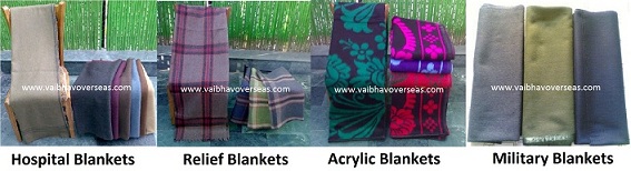 Unicef Relief Blankets,Army Blankets, Donation Blankets, Military Blankets,Hospital Blankets, Hotel Blankets, Army Blankets, Police Blankets,Donation Blankets,Diwali Gift Blankets,Polo Blankets, Mink Blankets,Corporate Gift Blankets, Woolen Blankets, Acrylic Blankets,Polar Blankets, Thermal/Cotton Blankets, Fleece Blankets, Medical Blankets to Various organizations like UNICEF, WHO,RED Cross,UNESCO, NGOs , Traders, Suppliers, Army, Police, Govt Hospitals, Railways and allied sectors.